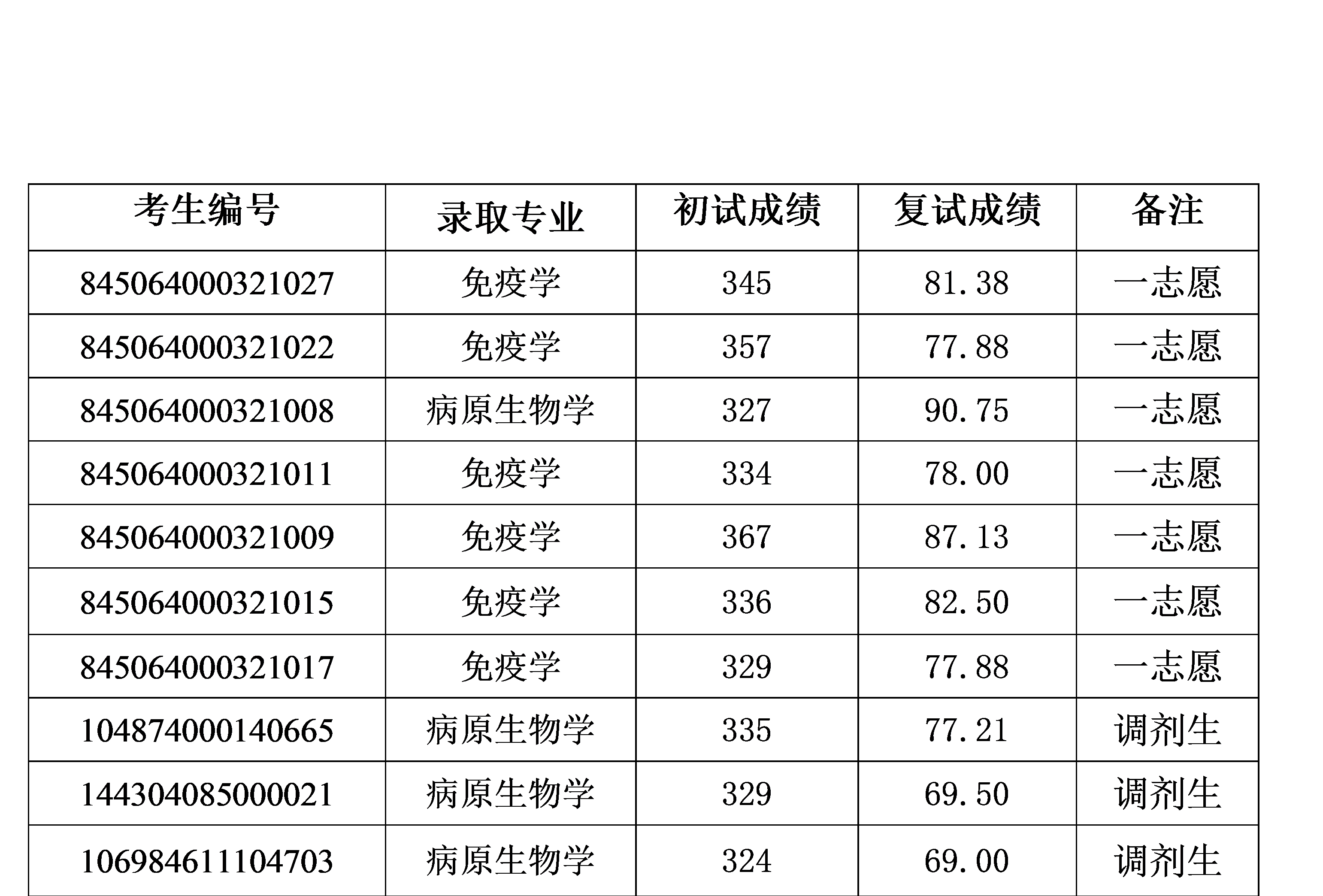 根據(jù)教育部關(guān)于印發(fā)《2024年全國(guó)碩士研究生招生工作管理規(guī)定》的要求,現(xiàn)將我所根據(jù)復(fù)試錄取方案確定的擬錄取名單予以公示(為保護(hù)考生隱私使用全國(guó)統(tǒng)考考生編號(hào)),公示期為2024年5月6日-2024年5月19日。公示期間,考生若有疑問(wèn),可向我所有關(guān)部門反映。武漢生物制品研究所研招辦及紀(jì)委聯(lián)系方式: